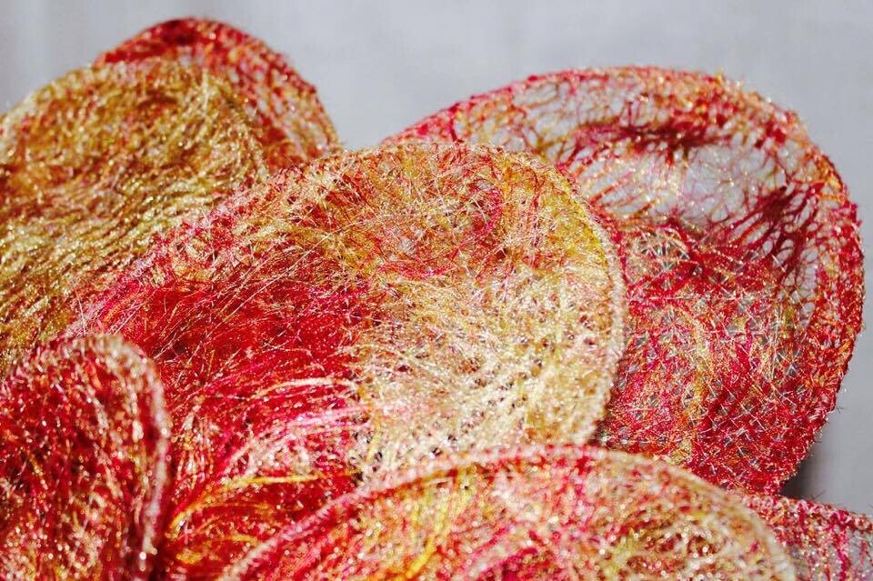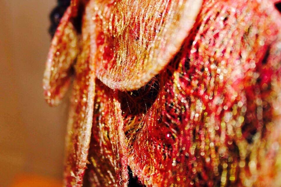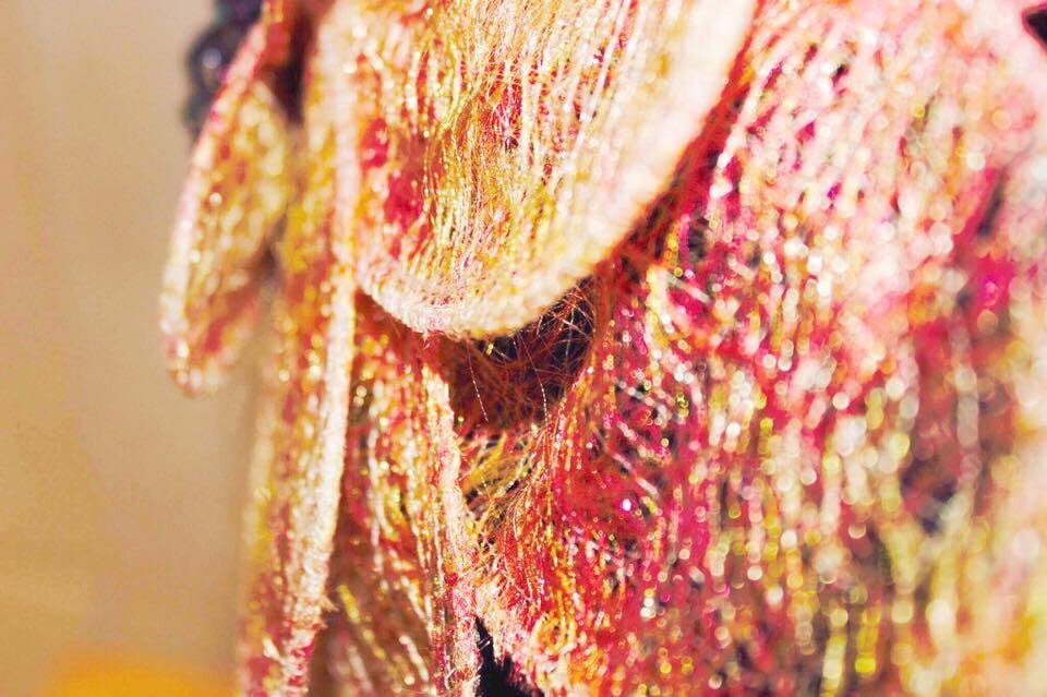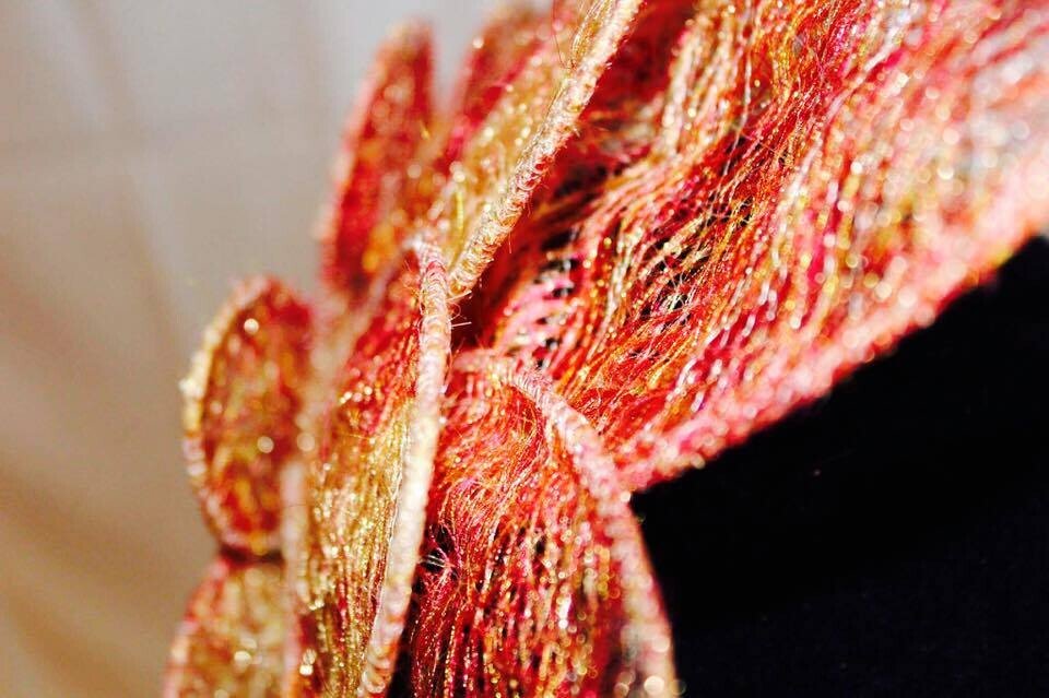 ‘Blackberry’ is a one of a kind piece which has been 100% created using Saraden Designs Handmade fabric. Pink and gold fibres have been combined in the fabric making process to give the fabric its unique colouring. This design can never be 100% replicated due its fabric uniqueness.