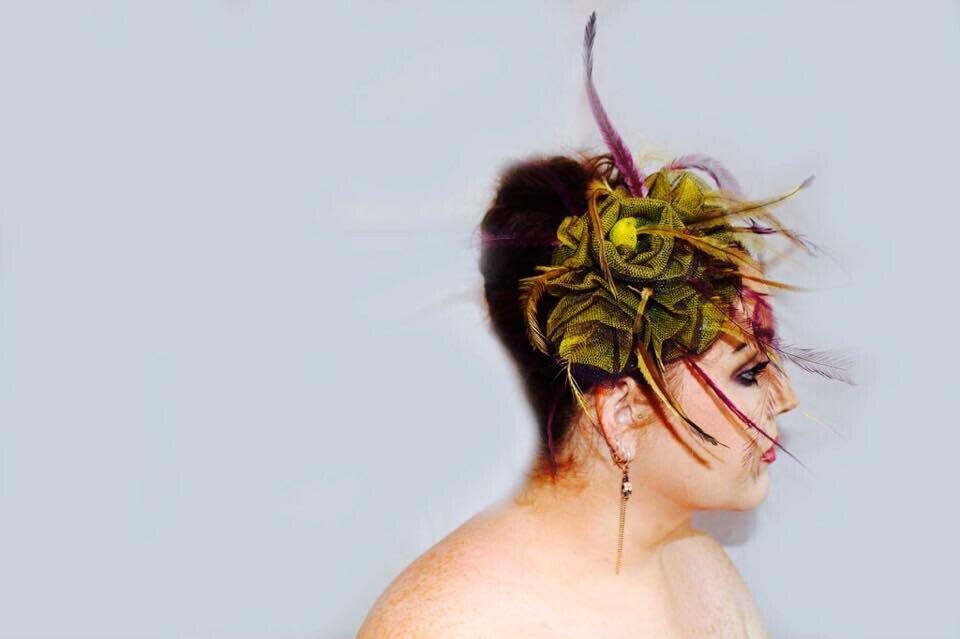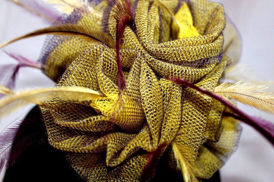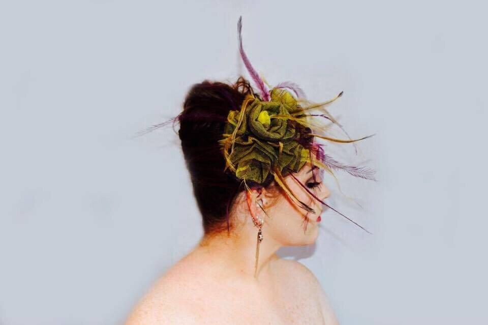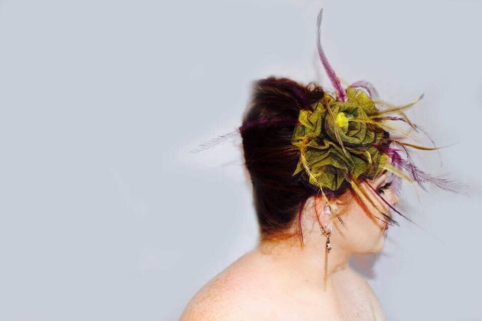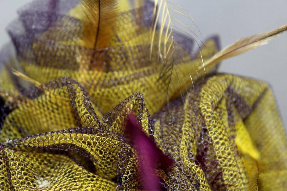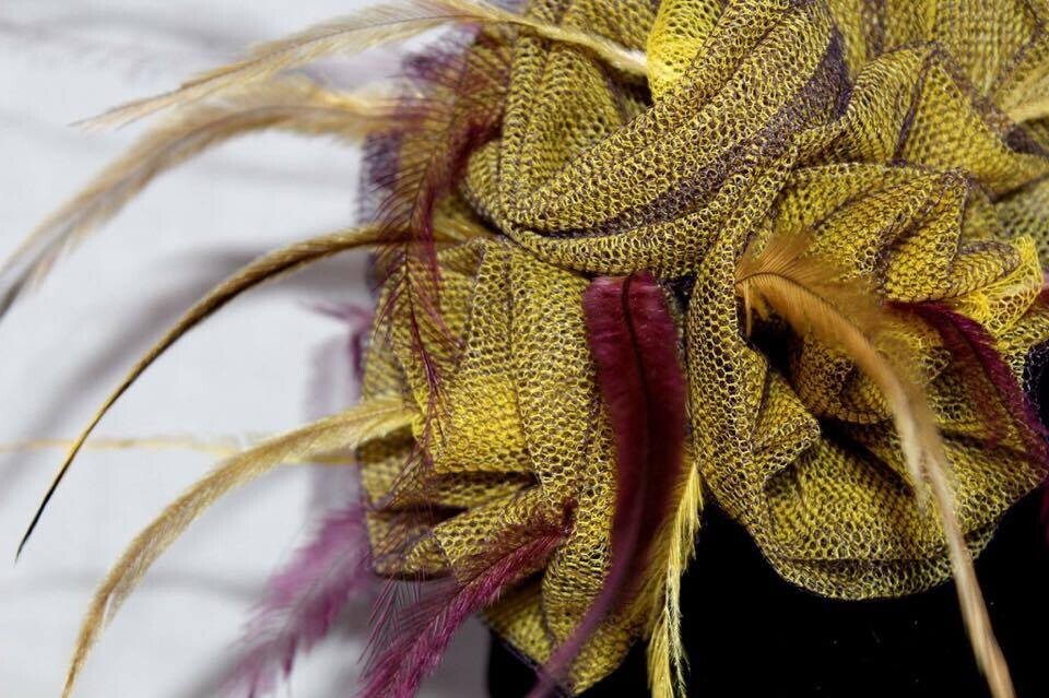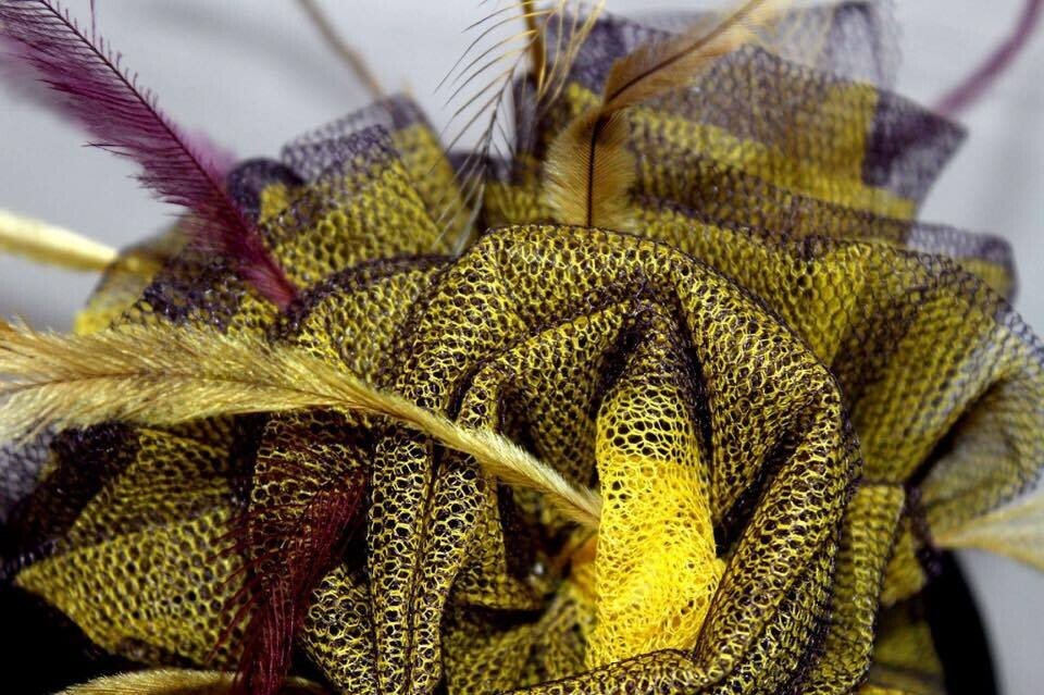 The colours have been echoed in the feathering. Purple and yellow emu feathers have been added to this design to really make it pop. The design is finished with a comb and elastic to secure to your head.