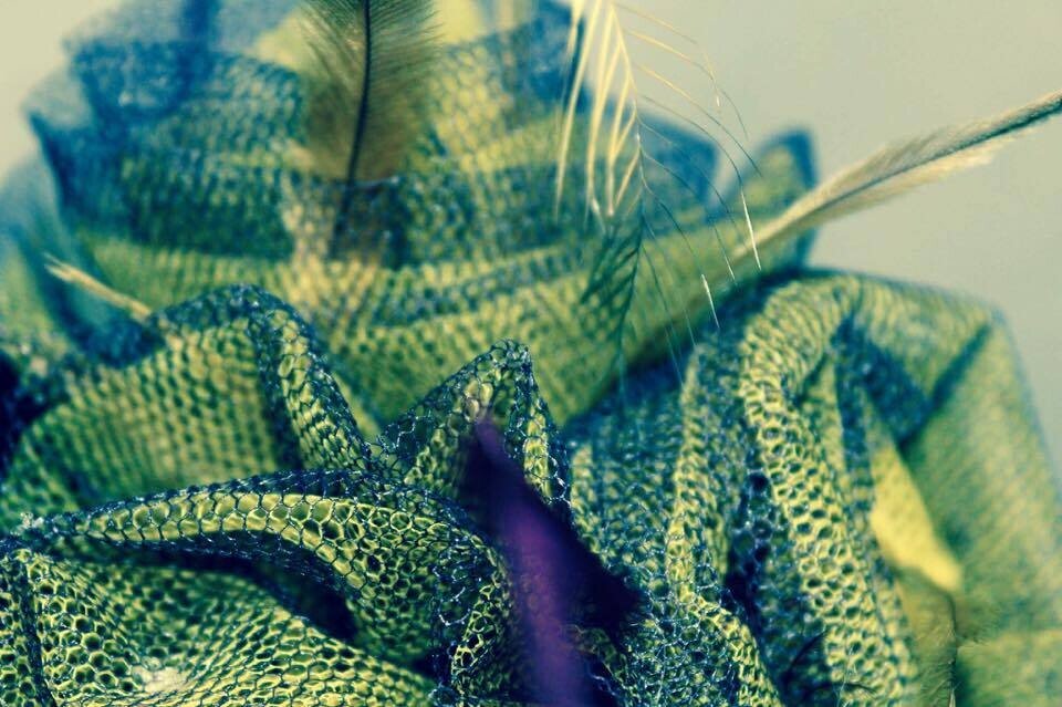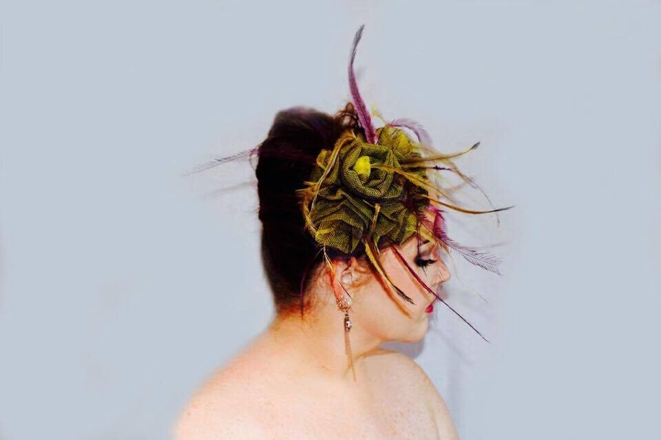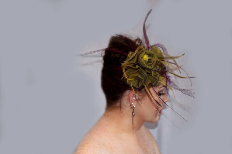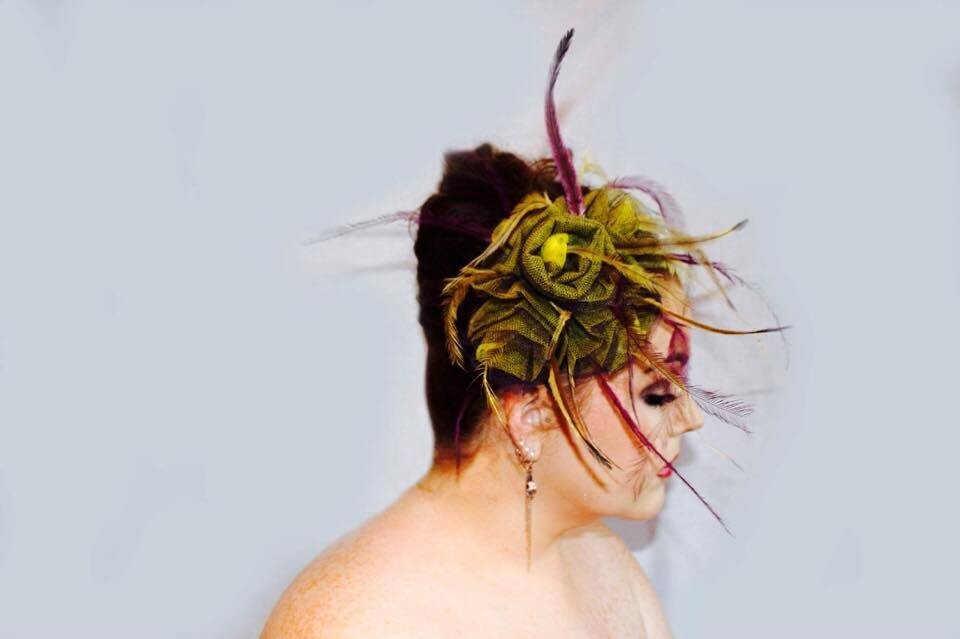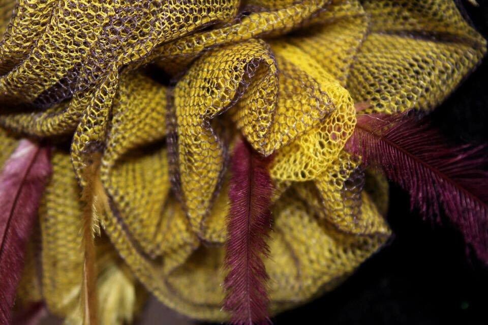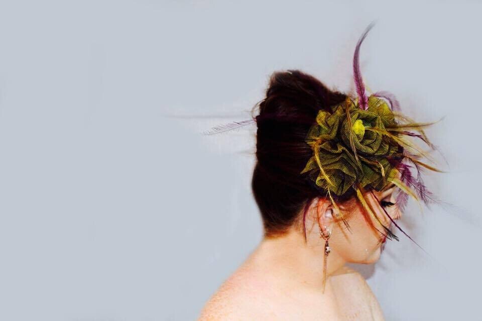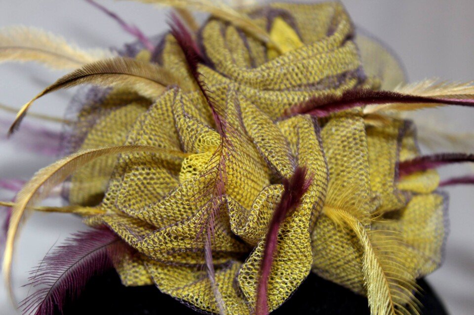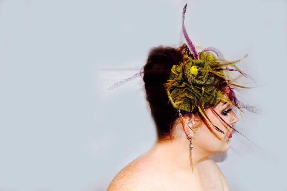 The colours have been echoed in the feathering. Purple and yellow emu feathers have been added to this design to really make it pop. The design is finished with a comb and elastic to secure to your head.