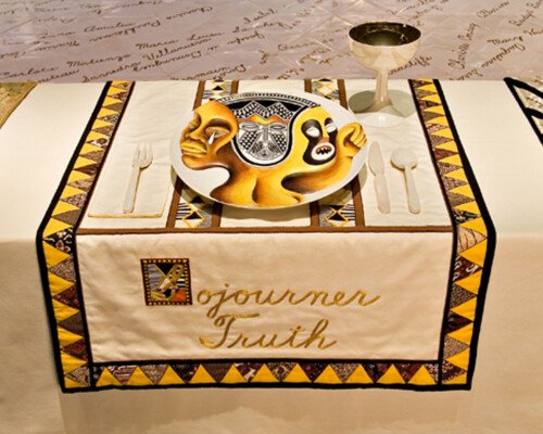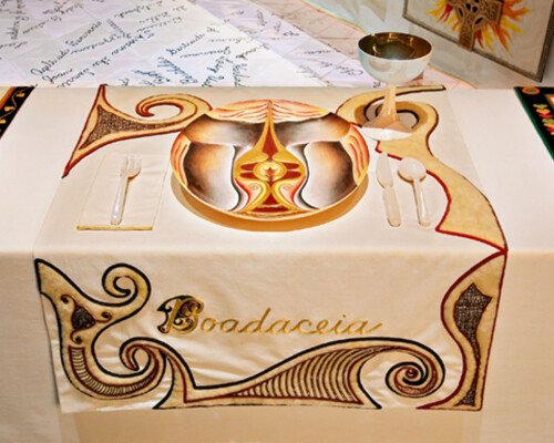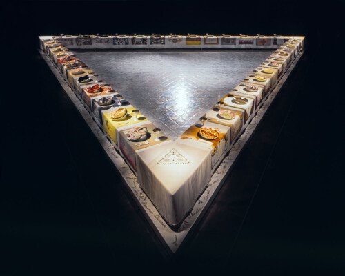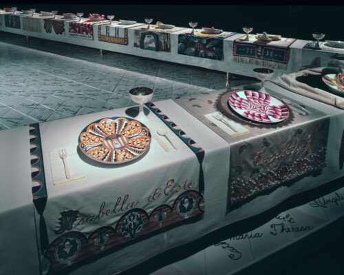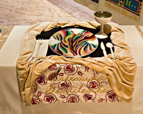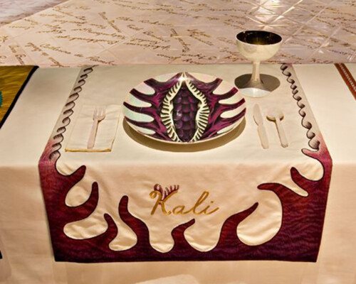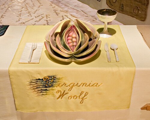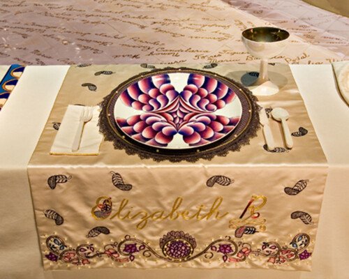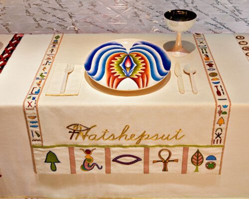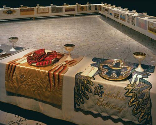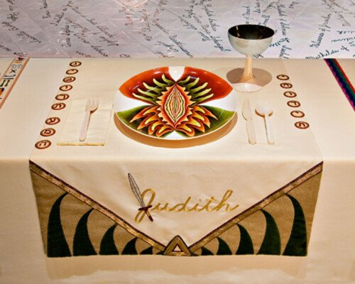 - In 1974 Judy began ‘The Dinner Party’. The use of ceramics, china painting, embroidery, and weaving were a means and an end. Because these media were disdainfully described as inferior women’s crafts by the male-dominated art world, one of Judy’s goals was to tumble this artificial hierarchy by integrating her artistic aesthetic and sill with those crafts, rendering them unequivocal equals of ‘fine art’. – ‘The Dinner Party is recognised as an iconic work of fine art. It is also monument to women, by women, using women’s crafts.’ – Elizabeth A. Sackler