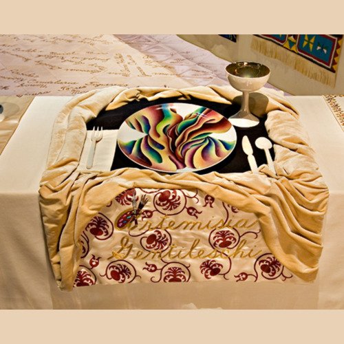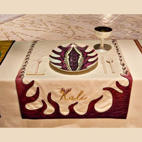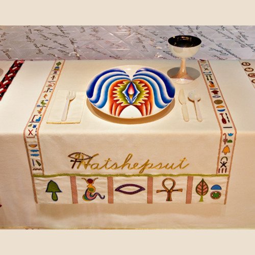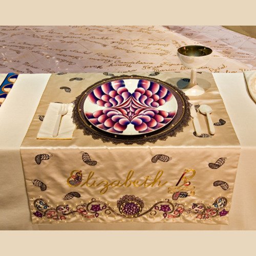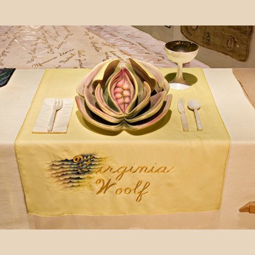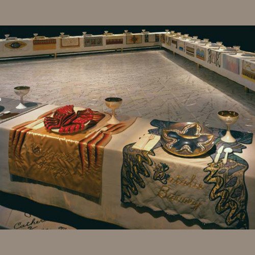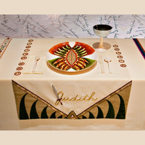 - In 1974 Judy began ‘The Dinner Party’. The use of ceramics, china painting, embroidery, and weaving were a means and an end. Because these media were disdainfully described as inferior women’s crafts by the male-dominated art world, one of Judy’s goals was to tumble this artificial hierarchy by integrating her artistic aesthetic and sill with those crafts, rendering them unequivocal equals of ‘fine art’. – ‘The Dinner Party is recognised as an iconic work of fine art. It is also monument to women, by women, using women’s crafts.’ – Elizabeth A. Sackler