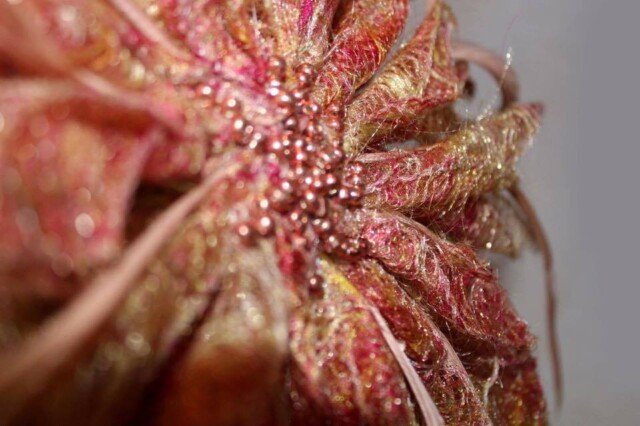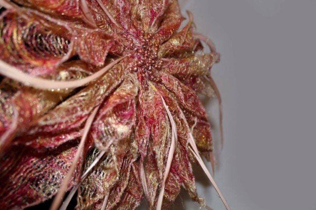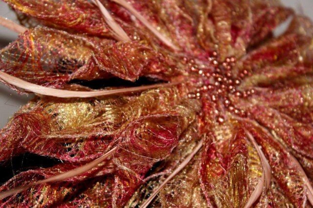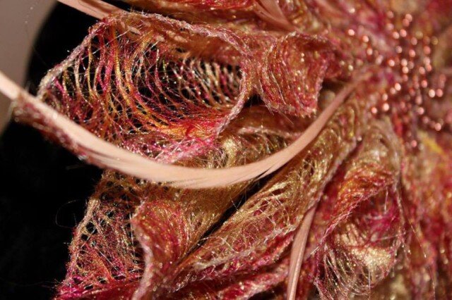The design which has been shortlisted is Anise, pictured below. Anise has been constructed using Saraden handmade fabric. I combined two fibre colours together pink and gold which gave me the unusual shade of colouring. I then cut out each piece in a leaf shape with the point and the top, sealed the edges and rolled them into a cigar shape with the point at the top, I then secured them into place by hand stitching.