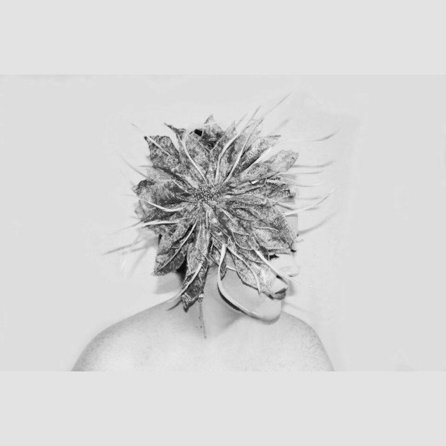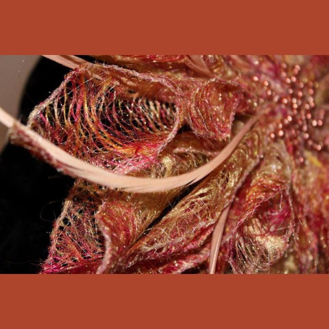 The shape reminded me of the Anise spice you use in cooking hence the name Anise. The design has been finished by placing complimenting peach feathers in between each layer. I then used bronze beads to created a subtle focus point in the middle of the piece in the same shape as the hat.