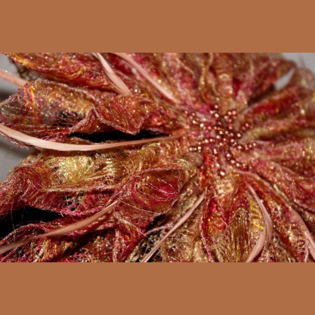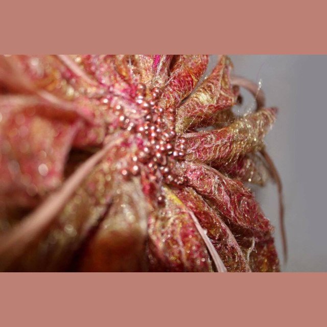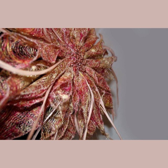 The design which has been shortlisted is Anise, pictured below. Anise has been constructed using Saraden handmade fabric. I combined two fibre colours together pink and gold which gave me the unusual shade of colouring. I then cut out each piece in a leaf shape with the point and the top, sealed the edges and rolled them into a cigar shape with the point at the top, I then secured them into place by hand stitching.