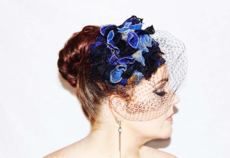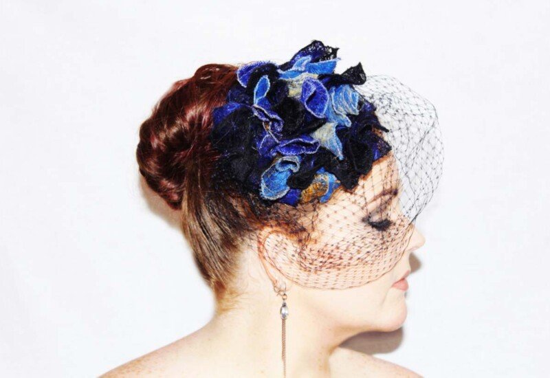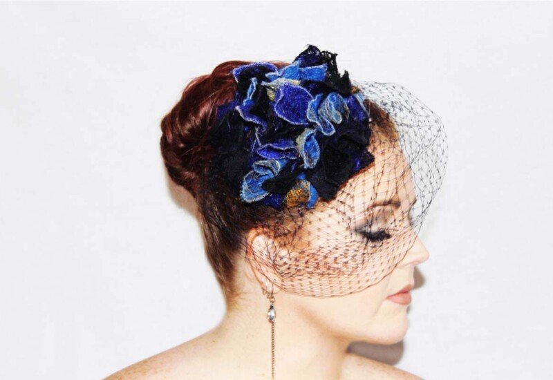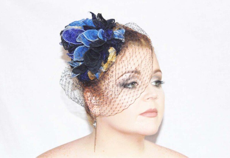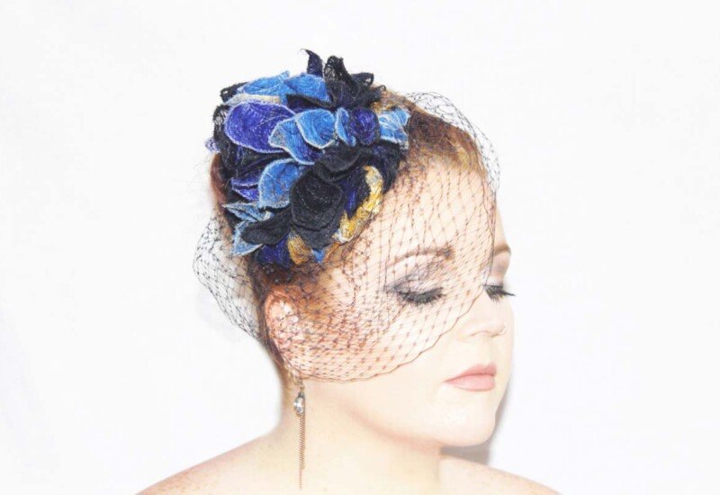 The Saraden fabric is a combination of gold, blue and black. Black veiling has been added to the deign which can cover one side of the face, it can be folded back throughout the day if desired. There is a comb attached to secure this piece to your head.