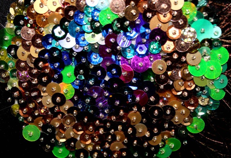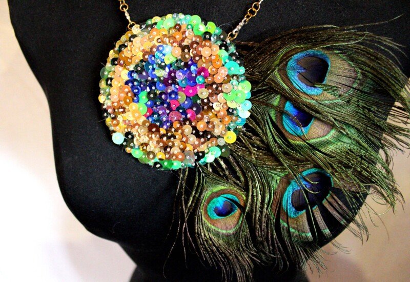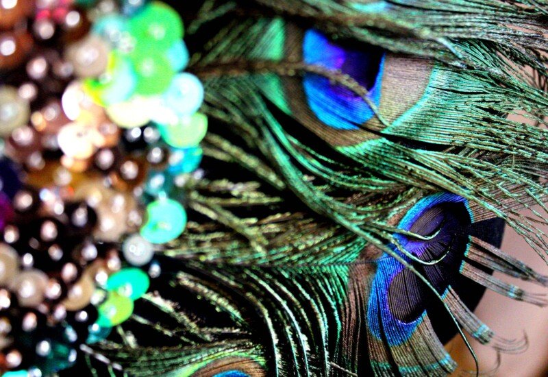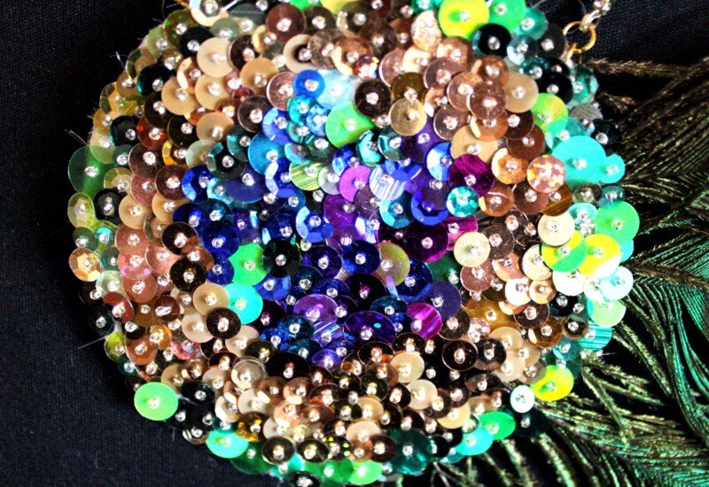 The design was created by sewing beads and colourful sequins in the peacock feather design, using greens, blues, bronzes, purples and brown colours. This piece is very intricate and is all is all hand sewn. Peacock feather have been incorporated into the design to really make it pop.